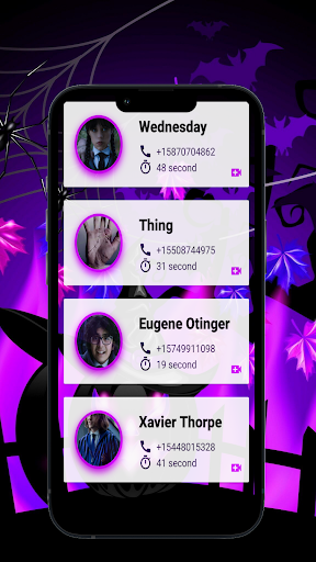 Wednesday Fake Video Call is an application that generates scary prank video calls similar to WhatsApp/Facebook live calls but simulated with your favorite Wednesday horror celebrities and stars like Wednesday Addams, Enid Sinclair, Bianca Barclay and Larissa Weems. It is an imitation call designed to accompany your days in your spare time, stop you from feeling lonely and bored and helps you obtain closer to your favorite horror celebrities and idols. The application is created for fun purposes only.